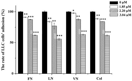 rAj-Tspin inhibited the adhesion of LLC cells. *, ** and ***, respectively, indicate p < 0.05, p < 0.01, and p < 0.001 (compared with the empty-medium groups).