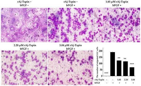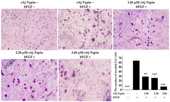 rAj-Tspin inhibited the invasion of LLC cells (OLYMPUS optical microscopy, 200×). ** and ***, respectively, indicate p < 0.01 and p < 0.001 (compared with the empty-medium and bFGF treatment groups).