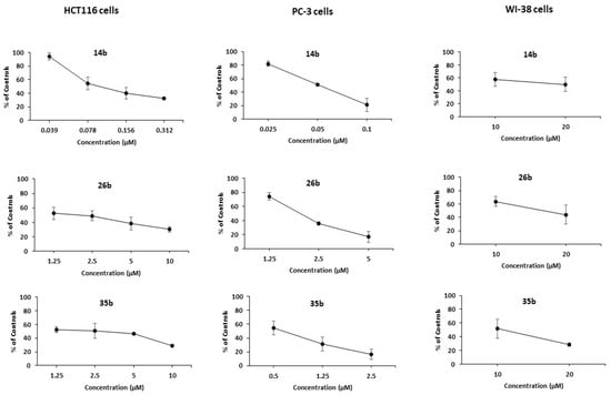 Dose-response curves for the administration of 14b, 26b, 35b on HCT116, PC-3 and WI-38 cells, as assessed by the MTT assay. Results are expressed as a percentage of controls. Statistical analysis was performed in triplicate determination at p < 0.05.
