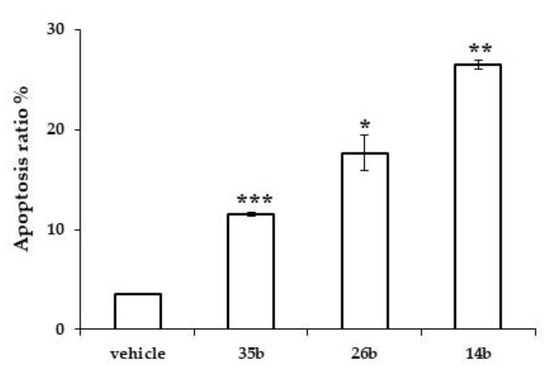 Doxorubicin, which was used as a positive control at a concentration of 25 nM, showed the expected G2/M phase blockade (58%) and the induction of apoptosis (28%), as previously reported [40]. Furthermore, 14b, 26b and 35b induced apoptosis in PC-3 cells after 72 h of treatment, as estimated by AnnexinV-7AAD staining. In particular, compound 14b induced the appearance of 26.5% (±0.47) apoptotic nuclei, 26b induced the appearance of 17.7% (±1.8) apoptotic nuclei and 35b induced the appearance of 11.5% (±0.19) apoptotic nuclei, compared to 3.5% (±0.05) induced by the vehicle (Figure 3). These data give an indication that the mechanism of action of compound 14b may include blocking of the cell cycle at the G2/M phase and inducing apoptosis.