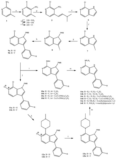 For the preparation of the series of pyrrolopyridines, we used the intermediate chlorides 9a,b, which were synthesized as depicted in Scheme 1. 2-Aminopicoline (1) was successively nitrated, diazotized and chlorinated to provide the nitropyridine 4 [26]. The reaction of 4 with DMF-dimethylacetal provided the enamine 5 that upon reduction was cyclized to result in the 7-chloropyrrolopyridine 6 [27] in 25% overall yield. The latter was iodinated, the pyrrole nitrogen was protected upon treatment with 4-methoxybenzylchloride (PMB-Cl) and the resulting iodide 8 underwent a Suzuki-type coupling with suitable boronic acids to give the chlorides 9a,b. All these reactions proceeded in high yields, and compounds were rationally characterized via 1H-NMR data. It is of interest to notice the characteristic chemical shift of the iodine bearing carbon (C-3) of compounds 7 and 8, which resonated at 56 ppm in the corresponding 13C-NMR spectra. The chlorides 9a,b were then treated with aniline, or 3,4,5-trimethoxyaniline in the presence of potassium tert-butoxide, tris(dibenzylideneacetone)dipalladium(0) [Pd2(dba)3] and 2,2′-bis(diphenylphosphino)-1,1′-dinapthalene (BINAP), to result in the amines 10a–d in good yields (60–91%). In parallel, since the nucleophilic substitution of the 7-chloro group of compounds 9 by alkylamines upon heating in DMF or DMSO was not successful, 9a,b were treated with m-chloroperoxybenzoic acid and were converted in good yield (88%) to the corresponding N-oxides 11a,b. These derivatives underwent nucleophilic substitution by N-methylpiperazine to provide the aminosubstituted compounds 12a,b in moderate yield (50%), which upon reduction gave the intermediates 13a,b. An interesting and indicative feature in the 13C-NMR spectral data of the N-oxides 11a,b and 12a,b was the chemical shift of C-5, which appears upfield, at 133–134 ppm, when compared to the corresponding peak of compounds 9a,b and 13a,b (C-5 resonance in this case is 137–138 ppm); this was obviously due to the presence of the neighboring N-oxide. Finally, the N1-substituted derivatives 10a–d and 13a,b were efficiently deprotected to result in the target pyrrolopyridines 14a–f in good to quantitative yields. In the 1H-NMR spectra of compounds 14a–f, the pyrrole H was detectable as a broad singlet at 10.5–11.8 ppm, whereas the NH of the 7-substituent of 14a–d was detected upfield at 8.6–9.4 ppm.