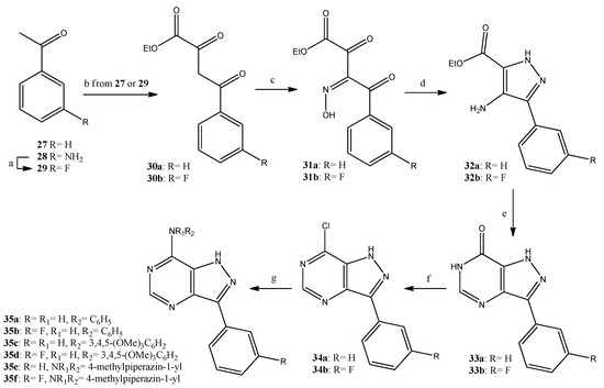 Finally, the pyrazolopyrimidine analogues were synthesized, as shown in Scheme 3, starting from the acetophenones 27 (commercially available) or 29 [32]. The acetophenones were subjected to side chain elongation upon reaction with ethyl oxalate, and the resulting dioxobutyrates 30a [33] and 30b [34] were converted in good yields (85%) to the corresponding α-(hydroxyimino)benzopyruvates 31a [35] and 31b, respectively. Compounds 31a,b were treated with hydrazine hydrate and were ring-closed with the concomitant reduction of the oxime group to result in the aminopyrazole-carboxylates 32a [36] and 32b, in moderate yields (40%). The reaction of the carboxylates 32a,b with formamidine gave the pyrazolopyrimidinones 33a [37] and 33b, which—through the corresponding chlorides 34a,b and the displacement of the chlorine by suitable amines—resulted in the target pyrazolopyrimidines 35a–f in good overall yields (over 40% for three steps). All new compounds were unambiguously identified using NMR and mass spectrometry data.