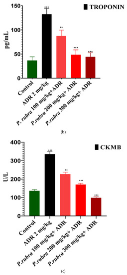 Cardioprotective effect of three doses of aqueous-methanolic leaf extract of P. rubra on the cardiac biomarkers, LDH (a), CK-MB (b), and troponin (c) against ADR-intoxicated MI. One-way ANOVA and Dunnett’s multiple comparison test were performed (** p < 0.005 & *** p < 0.001 & ns p > 0.005, n = 5).