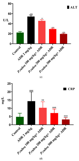 ADR considerably elevates the level of cardiac biomarkers (troponin, CK-MB, LDH) and cardiohepatic biomarkers (ALT, CRP, ALP, AST) (p < 0.05) regarding control. The rabbits in the ADR-intoxicated group (group 2) had significantly higher cardiac markers, whereas the three groups treated with P. rubra at different doses (100, 200, and 300 mg/kg body weight) demonstrated a dose-dependent resistance to the ADR-intoxicated cardiac damage. In contrast, the three groups receiving P. rubra leaf extract had lower average levels of troponin, CK-MB, LDH and AST, ALT, CRP, ALP (p < 0.05) than the ADR-intoxicated group (Figure 3 and Figure 4).