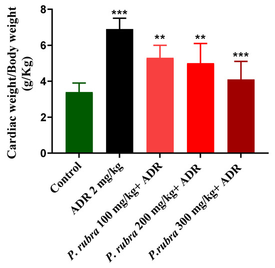 ADR noticeably increased the ratios regarding the control group. All three groups treated with P. rubra reduced their heart to bodyweight ratios less than the ADR-intoxicated group (Figure 5).