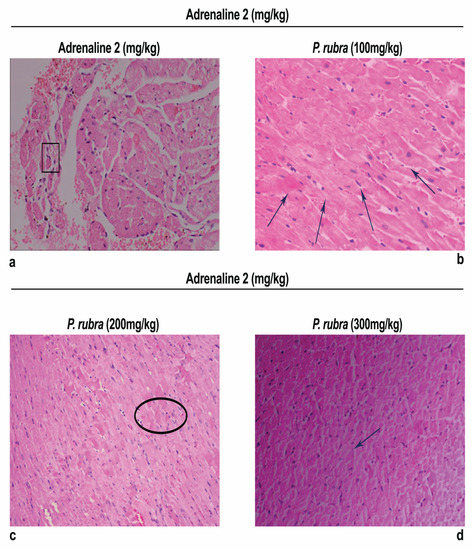 Histopathology of the ventricular portion of the ADR-intoxicated group revealed tremendous damage in cardiac cellular architecture, such as the disintegration and tearing of muscular fibers, capillary distention, vacuolar disintegration, mottled staining, interstitial oedema, mononucleate cellular infiltration, hemorrhage, and myocardium obstruction (Figure 6a). Less inflammatory cells and myocardial deterioration were observed in all three groups treated with P. rubra, while ruthless necrotic lesions were observed in the ADR-intoxicated group (Figure 6), which endorses the results of the biochemical investigation (Figure 3 and Figure 4), and justifies its use as a cardioprotective agent.