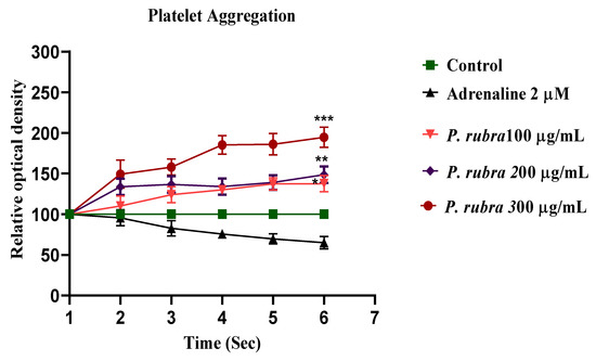 The addition of ADR (2 µM) to a suspension of rinsed human platelets resulted in a significant decrease in optical density at 600 nm, indicating platelet aggregation. At 37 °C, the aggregatory effect was observed. P. rubra (100, 200, and 300 µg/mL) reduced platelet aggregation in a dose-dependent pattern (* p < 0.05, ** p < 0.001, *** p< 0.0001) (Figure 8).