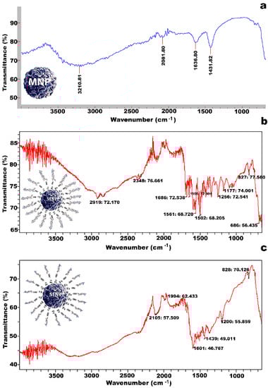 The FTIR spinal structure of MNPs, as given in Figure 3a, showed associated characteristic peaks such as the Fe-O stretching band at 635.72 cm−1 due to stretching vibration mode Mt-O-Mo, H2O bending vibration at 1369.91 and amide group peak at 3424.80 cm−1. The FTIR spectrum of MNP-F (Figure 3b) showed that the streaked peak of NH2 and C=O groups of folic acid were observed at 2348 cm−1 and 1561 cm−1, respectively. The presence of a new peak at 1177 cm−1 confirmed the conjugation of the bond between –NH2 groups of MNPs and –COOH groups of folic acid by carbodiimide method. The FTIR spectra of MNP-MTX showed that the streaked peak of NH2 groups of MNPs was observed at 2105 cm−1. The presence of a new peak at 1439 cm−1 indicated the successful conjugation of the –NH2 groups of MNPs with the –COOH groups of MTX by carbodiimide method (Figure 3c). The models of conjugation of MNPs with folic acid and MTX are shown in Figure 1a,b, respectively.