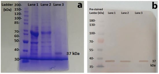 Anti-folate receptor antibodies were developed in rabbit by immunization with affinity purified folate receptor. ELISA was performed for the immunocharacterization of anti-FR antibodies, and results confirmed the presence of folate receptor antibodies. For molecular characterization, SDS PAGE was performed, and results showed the presence of FR protein at 37 kDa (Figure 4a). The mono-specific reactivity of anti-FR antibodies was further checked by Western blot analysis (Figure 4b). Samples were run on 10% SDS-PAGE and transferred onto nitrocellulose membrane. Immunochemical reaction showed clear bands at 37 kDa on the nitrocellulose membrane, which further confirmed the presence of an FR-specific antibody.