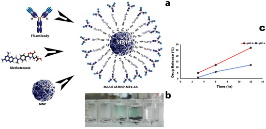 Schematic presentation, MagLISA and pH-dependent releasing behavior of MNP-MTX-FR Ab. (a) Schematic of conjugation of MTX on MNP and then FR antibody conjugation with nanocomposite on MTX. (b) MagLISA results. T1 and T2 are test wells, and C is the control well. (c) Drug releasing behavior at pH 5.5 and pH 7.4 at different time points.