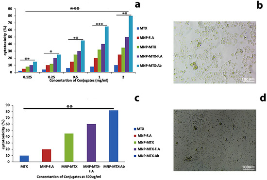 The cytotoxic effect of different nanocomposite concentrations increased proportionally with increasing conjugate concentration. The cells died due to the targeting of conjugate (MNP-MTX-FR Ab) to FR on HeLa cells by the endocytosis process (Figure 6a,d); on the other hand, control (Figure 6b) showed proper growth of cells in the absence of nanoconjugates. Means were compared with ANOVA and data in confidence interval with p value < 0.0001 for 1 mg/mL concentration, p value < 0.001 for 0.125, 0.5, and 2 mg/mL concentration, and p value < 0.01 for 0.25 mg/mL concentration.