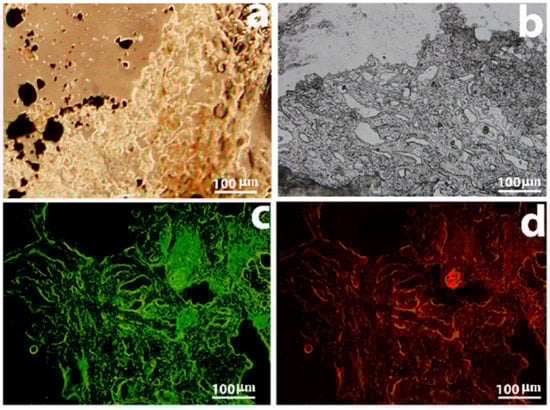 Mouse mammary tumor was processed to examine the tissue-binding ability of nanocomposites. Binding and the presence of nanocomposites in tumor tissue were confirmed by examining the section under bright field microscope (Figure 8a,b); nanocomposites could be traced. Binding of FITC conjugated anti-rabbit antibodies to folate receptor antibody gave green fluorescence and confirmed (Figure 8c) the attachment of MNP-MTX-FA Ab nanocomposites to folate receptors expressed on tumor cells. Red fluorescence confirmed the attachment of anti-MTX antibody to MTX (Figure 8d), which subsequently attached to MNP-MTX-FR Ab, as discussed earlier.