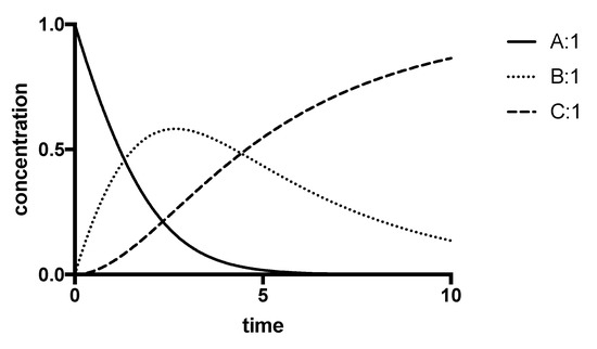 The steady-state kinetic relationships describing each of the above can be found in most biochemistry textbooks and many more specific books, with that by Segel [1] being exhaustive in its coverage, as well as in detailed articles (e.g., [2,3,4,5]). Their application is dependent on the values of the kinetic parameters used. Thus, it is important to understand the reliability of reported values or how to ensure the accuracy and precision of values that you determine yourself. The basic approach to deterministic systems modelling can be illustrated by the simple example of a sequence of reactions catalysed by two enzymes shown in Figure 1.