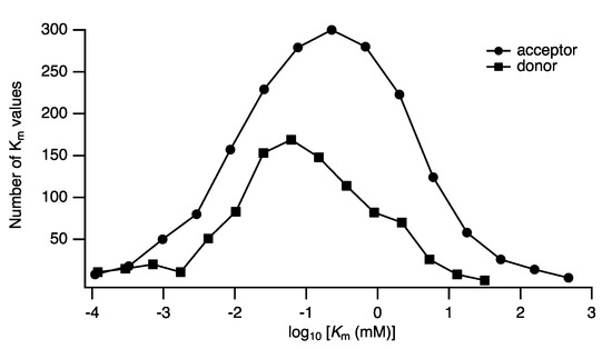 is more appropriate. The value expresses a factor of the mean instead of a difference, thus approximately 68% of the values are expected to lie in the interval {GM/GSD, GM × GSD}. In the example given in Figure 4, the expected values of glycosyltransferase acceptors () were found to be distinct from those of the nucleotide-sugar donors (), with calculated geometric means of 0.33 mM (GSD: 13.0) and 0.15 mM (GSD: 8.7), respectively. Such meta-studies, using data derived from BRENDA or SABIO-RK, could be useful in determining appropriate parameter ranges for use in systems-biological models.