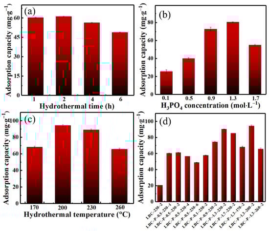 Different conditions—including hydrothermal reaction time, temperatures, and the addition concentrations of H3PO4 activation agent—were chosen to determine the optimal hydrothermal synthesis conditions of biochar with the addition of H3PO4 activation agent, and detailed information of hydrothermal synthesis were shown in Tables S1–S3. Figure 1 displayed the adsorption capacities of Cd(II) on the H3PO4-activated biochar obtained with different synthesis conditions. For the biochar derived from hydrothermal reaction time, the sample obtained by hydrothermal reaction of 2 h exhibited the highest adsorption capacity at approximately 61.4 mg∙g−1, while further increasing hydrothermal reaction time, the adsorption capacity underwent a markable drop to approximately 12.3 mg∙g−1 (Figure 1a). It could be seen from Figure 1b that the adsorption capacities of biochars obtained at different activator concentrations increased with an increase in the concentration of H3PO4 activating agent. The highest adsorption capacity of such biochar increased to circa 90.2 mg∙g−1 with an activator concentration at 1.3 mol∙L−1. Further increasing the H3PO4 activator concentration to 1.7 mol∙L−1 results in the adsorption capacity of the obtained biochar decreasing slightly (Figure 1b). For the effect of hydrothermal reaction temperature on the adsorption capacities of as-prepared biochar, the hydrothermal temperature at lower than 200 °C was not conducive to the formation of good lettuce waste-based biochar (Figure 1c). The optimal hydrothermal temperature to synthesize biochar was determined at 200 °C. Taken together, the optimal hydrothermal synthesis conditions of biochar from lettuce wastes were determined as the follows: hydrothermal reaction time at 2 h, the H3PO4 activator concentration of 1.3 mol∙L−1, and hydrothermal temperature at 200 °C. As shown in Figure 1d, under optimal hydrothermal synthesis conditions, the as-fabricated LBC-P-1.3-200-2 biochar sample exhibited a equilibrium adsorption capacity of Cd(II) at circa 94.2 mg∙g−1. Therefore, the as-fabricated LBC-P-1.3-200-2 biochar was chosen for subsequent characterization and adsorption testing.