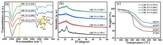 (a) FT-IR spectra, (b) XRD patterns, and (c) TG curves of LBC-P-1.3-X-2 (X = 170, 200, 230, and 260 °C) samples.