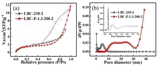 (a) N2 adsorption–desorption isotherms and (b) corresponding pore size distribution profiles of LBC-230-2 and LBC-P-1.3-200-2 samples.