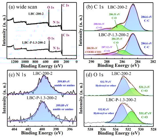 The XPS spectra of (a) wide scan, (b) C 1s, (c) N 1s, and (d) O 1s for the LBC-200-2 and LBC-P-1.3-200-2.