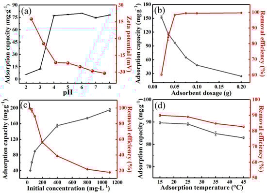 Effect of different environmental factors on the Cd(II) adsorption capacity on the LBC-P-1.3-200-2 biochar sample: (a) initial solution pH and zeta potentials, (b) adsorption dosages, (c) initial concentrations of Cd(II), and (d) adsorption temperature. Batch experimental conditions: T = 25 ± 1 °C, C0 = 100 mg∙L−1, m = 1.0 g∙L−1, v = 50 mL, t = 100 min, pH = 6.0.