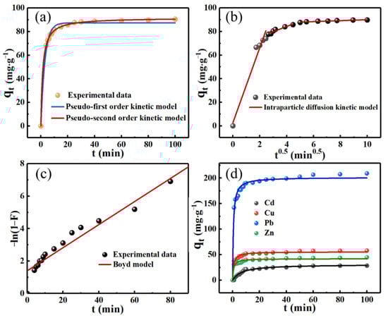 Adsorption kinetics of Cd(II) on the LBC-P-1.3-200-2 biochar and data fitting with (a) the pseudo-first order and pseudo-second order model, (b) Weber–Morris model, and (c) Boyd model. (d) Adsorption kinetics for Cd(II), Cu(II), Zn(II), and Pb(II) on the LBC-P-1.3-200-2 and data fitting with a pseudo-second order model. Batch experimental conditions: T = 25 ± 1 °C, C0 = 100 mg∙L−1, m = 1.0 g∙L−1, v = 50 mL, t = 100 min, pH = 6.0.