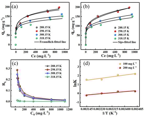 The adsorption capacity of the biochar can be evaluated by the adsorption isotherms, and the interaction between the Cd(II) ions and the biochar can be learned by the adsorption isotherms during the adsorption process []. Figure 8 showed the adsorption isotherms of Cd(II) ions on the LBC-P-1.3-200-2 at different adsorption temperatures from 288.15 to 318.15 K. The result showed that a higher removal efficiency was achieved at a lower concentration of Cd(II). When the Cd(II) concentration was increased to 1100 mg∙L−1, the equilibrium adsorption capacity of Cd(II) ions amounted to as high as circa 196.5 mg∙g−1. Moreover, the adsorption performance of Cd(II) decreased as the adsorption temperature increased, indicative of an exothermic adsorption process of Cd(II) ions on the as-prepared biochar sample.