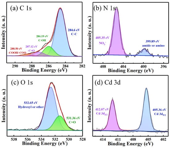 XPS spectra of (a) C 1s, (b) N 1s, (c) O 1s, and (d) Cd 3d for the LBC-P-1.3-200-2-Cd after adsorption of Cd(II). Batch adsorption experimental conditions: pH = 6.0, C0 = 100 mg∙L−1, m = 1.0 g∙L−1, v = 50 mL, T = 25 ± 1 °C, and t = 100 min.