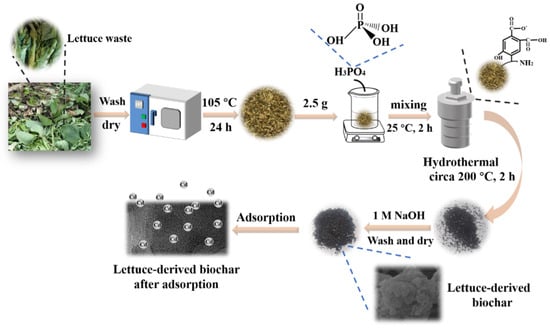 The biochar samples were prepared by hydrothermal synthesis method with lettuce vegetation wastes as raw materials. Typically, the deionized water was used to wash impurities of lettuce waste and dried at 105 °C for 24 h, crushed and stored in a sealed container. Then, 2.5 g of dried lettuce waste was mixed with 50 mL of deionized water solution for 2 h. The mixed solution was transferred to a 100 mL PPL-lined autoclave (Enotai Instruments and Equipment Co., Beijing, China) to react at 230 °C for 2 h, and then cooled down to room temperature. The resultant biochar was removed out and filtered with qualitative filter paper. The solids retained by the filter paper were soaked in 1 mol·L−1 NaOH solution for 2 h to remove the impurity and tar. Then using a large amount of deionized water to wash the biochar until the pH was neutral. The resultant sample was dried at 60 °C for 12 h in an oven, then grinded in an agate mortar and the as-fabricated adsorbent was labeled as LBC-230-2 (L = lettuce waste, BC = biochar, hydrothermal temperature = 230 °C and time = 2 h).