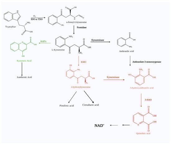 Most of the work dealing with kynurenine metabolism focuses on how it relates to neurodegenerative diseases. The disruption of the KP, however, can also have considerable effects on behaviors relevant to neuropsychiatric indications, including schizophrenia, depression, and attention-deficit/hyperactivity disorder (ADHD). Neuro-inflammation has been reported in conjunction with psychiatric disorders to produce pro-inflammatory mediators that are capable of activating tryptophan catabolism via the kynurenine pathway and shifting it towards the neurotoxic arm where NMDA receptors are stimulated. The serum or plasma imbalance of KP metabolites is present in the cerebrospinal fluid (CSF), as well as certain areas of the brain. These metabolites interact with other neurochemicals, contributing to the pathophysiological mechanism in psychiatric disorders. For this reason, kynurenine metabolites can also be used as biomarkers for certain neuropsychiatric diseases [91]. Tryptophan is the precursor of serotonin, the neurotransmitter known for its overall effect of contributing to happiness and well-being [92]. The depletion of tryptophan results in the depletion of serotonin, yielding a depressed mood state. Depression, also referred to as clinical depression or major depressive disorder (MDD) [93,94], is a multifactorial mood disorder that is characterized by anhedonia [95]. It is well documented in patients with MDD that IL-4, IL-10, and other anti-inflammatory cytokines are unmatched in antagonizing pro-inflammatory cytokines IL-2, IL-6, soluble IL-6 receptor, TNF α and IFN- γ [91]. These pro-inflammatory mediators are capable of stimulating both IDO and KMO activity in the KP, not only depleting TRP, but also shifting the KYN metabolism towards 3-HK and QUIN production [96]. The microglia are commonly accepted as the place where the brain KMO activity increases in response to peripheral inflammation, but studies have also shown an increase in NeuN-positive neuronal cells in the hippocampal dentate gyrus [97]. For this reason, it has been proposed that the imbalance of neurotoxic metabolites and KYNA may be responsible for exposing the astrocyte–microglia-neuronal networks to environmental factors, such as stress, which may possibly be a contributing factor to the intermittent and persistent nature of MDD [91]. Studies suggest that depressed patients not only have a reduction in the availability of TRP, but also a higher activity of TRP breakdown and significantly decreased levels of plasma KYNA [7]. This trend is not only present in adult depression, but also in adolescent depression [98].