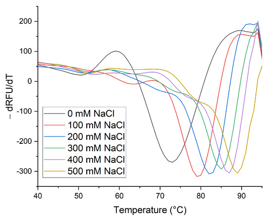 Thermal denaturation of the native protein at pH 7.0 with increasing NaCl concentrations (0 mM; 100 mM; 200 mM; 300 mM; 400 mM; 500 mM). First-order derivatives generated as a function of temperatures.