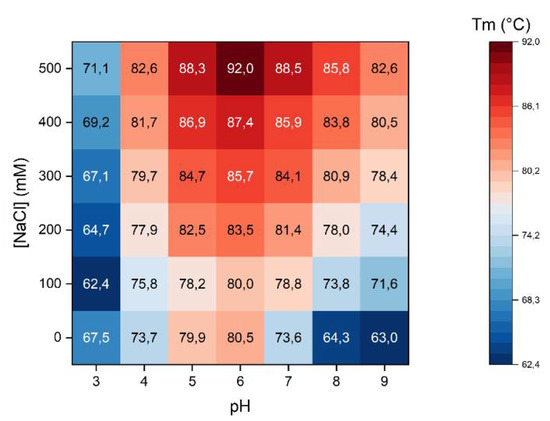 As NaCl concentration increased, Tms were higher. This was observed at every pH tested as it could be expected for a protein belonging to globulin class, as β-vignin actually is, whose solubility is enhanced by increasing ionic strengths. Data indicated that the highest stabilities were obtained at pH 5.0 and 6.0. However, the solubility experiment previously shown (Figure 1), evidenced that at these pH levels the solubility of the protein is minimal. The results obtained by TSA should thus be interpreted considering all these data. At a pH around 5.0 and 6.0, β-vignin is likely present as a stable aggregate that undergoes the unfolding transition at temperatures higher than at a pH at which the protein is fully soluble. The formation of these aggregates is likely mediated by hydrophobic interactions which may trap the fluorescent dye even at relatively low temperatures (i.e., room temperature). Raw data curves of these samples (Supplementary Figure S1) indeed show high relative fluorescent unit (RFU) values yet at low temperatures. This indicates that the interaction of the dye with exposed hydrophobic patches occurs in proximity of the protein pI, resulting in a very stable aggregate of native proteins. Considering instead those pH levels at which the protein is soluble, the highest protein stability was obtained at pH 7.0, where even with low NaCl concentrations, Tms values higher than 74 °C were recorded. For samples tested at pH 4.0, 5.0 and 6.0 the standard error was Tm ± 0.3 °C, while at pH 3.0, 7.0, 8.0 and 9.0 the standard error was Tm ± 0.1 °C.