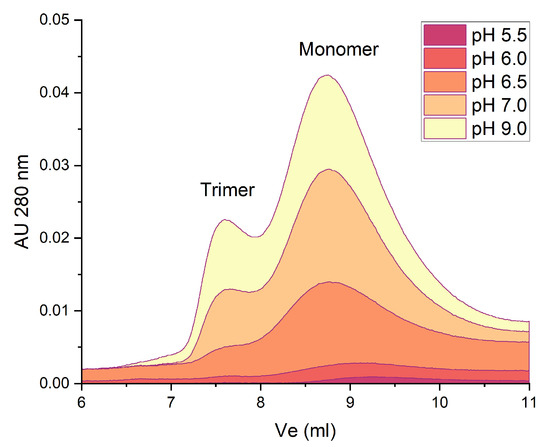 Once we determined the pH and ionic strength conditions at which β-vignin showed maximum stability in solution, we decided to investigate its attitude to oligomerization using a size exclusion chromatography (SEC) approach to shed light on β-vignin monomer to trimer transition as a function of the pH. As a matter of fact, the correlation between pH and oligomerization of seed globulins has been already observed [16,20]. The results are shown in Figure 4. As expected, at a pH of 5.5, close to its isoelectric point, no β-vignin is present in solution. At pH 6.5, where the solubility of the protein rapidly increases (Figure 1), the monomeric form is the predominant species. The trimer/monomer ratio progressively increased at basic pH levels, confirming a pH-dependent oligomerization of β-vignin protein (Table S1).