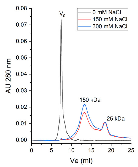 Salt-dependent aggregation state of β-vignin was evaluated by size exclusion chromatography (SEC) using a Superdex 200 10/300 GL column (30 cm × 10 mm) previously equilibrated with 25 mM Tris-HCl buffer, pH 9.0, with different concentrations of NaCl (0 mM, 150 mM and 300 mM).