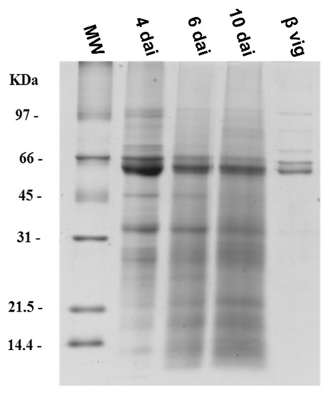 In all samples, β-vignin appears as a double band. The two polypeptides differ for their glycosylation status, with the larger one glycosylated and the smaller one non-glycosylated [6]. Purified β-vignin was then incubated with the three described extracts at 37 °C for up to 30 h (Figure 7).