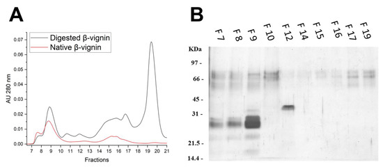 Non-denaturing and denaturing analysis of native and digested β-vignin. Panel (A): Superdex S75 10/300 column GL (30 cm × 10 mm) SEC of the native protein (red line) and of the digested protein (black line). For each run, 50 μg of β-vignin (0.5 mg/mL) was loaded. Panel (B): SDS-PAGE of the SEC eluted fractions from the digested β-vignin. The gel was silver stained.