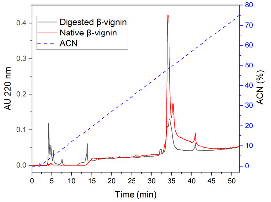 The undigested protein (Figure 9, red line) shows an elution profile where two major peaks are present and elute with an acetonitrile (ACN) concentration, respectively, of 48% and 50%. They likely correspond to the two major β-vignin polypeptides also evident from all the reported SDS-PAGE analyses and previously described [6]. In the 30 h digested sample (Figure 9, black line), additional peaks eluting at lower ACN concentrations appear, as a result of the proteolytic events, and the peaks corresponding to the two major polypeptides decreased. These data corroborate our previous analyses indicating that the two polypeptides do not completely disappear; rather, a proteolysis resistant core remains associated with the proteolytic products generated by the endogenous cowpea proteases.