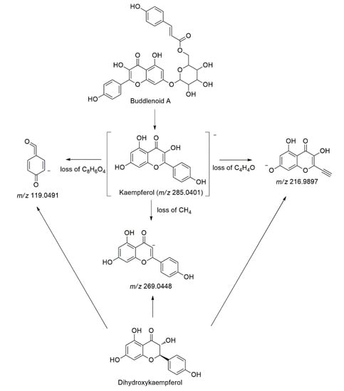 Kaempferol (Peak 24) was identified at tR = 11.87 min with a deprotonated molecule [M-H]− at m/z 285.0401, which later produced three characteristic fragment ions in the MS/MS analysis at m/z 269.0448 [M-H-16]− due to the loss of CH4, m/z 216.9897 [M-H-68]− due to the loss of C4H4O and m/z 119.0491 [M-H-166]− due to the loss of C8H6O4 [40]. Identification of kaempferol was confirmed with the authentic standard. Buddlenoid A (Peak 12) and its isomer (Peak 14) were identified at (tR = 9.43 and 9.75 min). These compounds showed a deprotonated molecule [M-H]− at m/z 593.1304, which later produced six characteristic fragment ions in the MS/MS analysis at m/z 447.0935 [M-H-146]−, 429.0823 [M-H-164]−, and 285.0404 [M-H-308]−. The fragmentations occur due to the loss of C9H6O2, C9H8O3, and C15H16O7, respectively. Besides that, the compounds also show a fragmentation pattern typical of kaempferol aglycone at m/z 269.0448, 216.9897, and 119.0491 [41]. This compound was previously isolated and characterized in this plant by Nshimo et al. [42]. Figure 3 depicts the main fragmentation pathways of the kaempferol derivatives. Buddlenoid A dimer (Peak 13) was also identified in abundance at tR = 9.49 min with a deprotonated molecule [M-H]− at m/z 1187.2678. This compound exhibited the same fragmentation patterns in the MS/MS analysis as buddlenoid A, with double of its monomer [41]. Another kaempferol derivative was also identified in the chromatogram at tR = 13.63 min, with a deprotonated molecule [M-H]− at m/z 287.0539. Additionally, m/z 271.0607 [M-H-16]− occurs due to loss of CH4 in the MS/MS analysis, while m/z 269.0723, 216.9894, and 119.0077 are typical fragments for kaempferol derivatives [40]. Hence, this compound was identified as dihydrokaempferol (Peak 37).