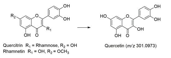 Quercitrin (Peak 21) and its isomer (Peak 23) was identified at tR = 11.02 and 11.17 min, with a deprotonated molecule [M-H]− at m/z 447.2237, which later produced three characteristic fragment ions in the MS/MS analysis at m/z 301.1495 [M-H-146]− as the base peak for quercetin, m/z 285.2063 [M-H-162]− due to the loss of C6H10O5 and m/z 245.0717 [M-H-202]− due to the loss of C8H10O6 [40]. Identification of this compound was further confirmed with the authentic standard. Rhamnetin (Peak 52) were also characterized at tR = 12.58 min based on its protonated molecule [M+H]+ at m/z 317.0671 and the three fragmentation ions in the MS/MS analysis. At m/z 301.0973 [M+H-16]+ arose as the base peak for quercetin, as shown in Figure 4. The m/z 285.0734 [M+H-31]+ and m/z 245.1063 [M+H-71]+ occurred due to the loss of CH3O and C3H3O2, respectively [40].