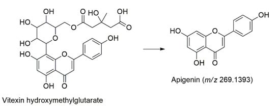One apigenin derivatives named vitexin hydroxymethylglutarate (Peak 30) was identified at tR = 12.72 min, based on its deprotonated molecule [M-H]− at m/z 571.748 and the three fragmentation ions in the MS/MS analysis. The product ions were m/z 513.0697 [M-H-62]− due to CH2O3, m/z 341.1581 [M-H-234]− occur due to loss of C9H14O7 and m/z 269.1393 [M-H-306]− as the base peak of apigenin, as shown in Figure 5 [43].