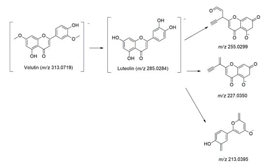 One luteolin derivative named velutin (Peak 40) was tentatively identified, as they share three significant product ions [M-H]− at m/z 285.0284, 255.0299, 227.0350, and 213.0395, which were the base peaks for luteolin aglycone [40]. Velutin and its isomers (Peak 40, 45, and 46) were identified based on its deprotonated molecule [M-H]− at m/z 313.0719 at tR = 14.03, 15.01, and 15.19 min [40]. Figure 6 shows the main fragmentation pathways found in luteolin derivatives.
