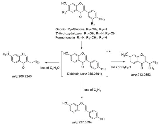 The fragmentation pathways of the daidzein derivatives.