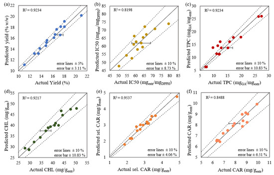 Experimental versus predicted values of (a) yield, (b) antioxidant activity, (c) total phenolic content, (d) total chlorophyll content, (e) selected carotenoid content, and (f) total carotenoid content. Error bars express experimental standard deviation.