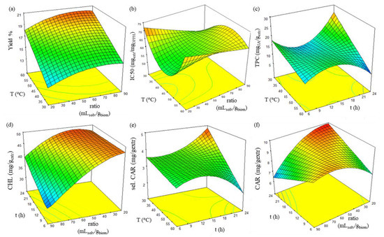 where yield is expressed in % w/w (gextr/gbiom), antioxidant activity in mgextr/mgDPPH, total phenolic content in mgGA/gextr, and total chlorophyll, carotenoid, and selected carotenoid content in mg/gextr, while T, t, and ratio stand for the extraction temperature (°C), duration (h), and solvent-to-biomass ratio (mLsolv/gbiom).