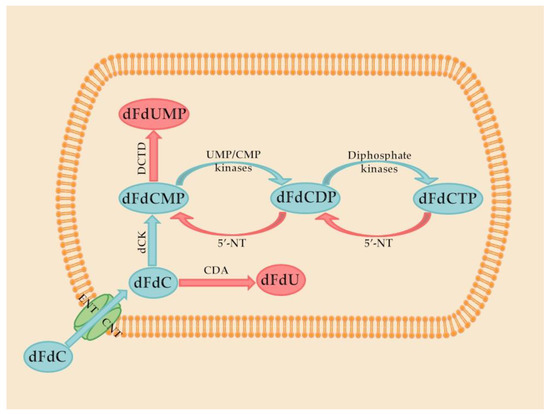 Phosphorylation and dephosphorylation of gemcitabine (dFdC) in the cell. ENT: equilibrative nucleoside transporters, CNT: concentrative nucleoside transporters, dFdCMP: gemcitabine monophosphate, dFdCDP: gemcitabine diphosphate, dFdCTP: gemcitabine triphosphate, dFdU: 2′,2″-difluorodeoxyuridine, dFdUMP: 2′,2′-difluorodeoxyuridine monophosphate, CDA: cytidine deaminase, DCTD: deoxycytidylate deaminase, 5′-NT: 5′-nucleotidase, UMP/CMP kinase: nucleoside monophosphate kinase. Upper left corner is the gemcitabine molecular structure.