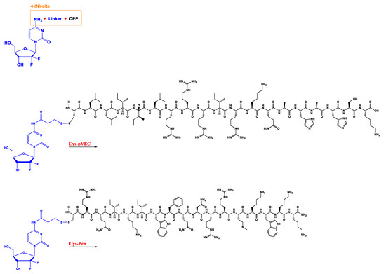 In the first study, the aniline moiety of gemcitabine was conjugated with two CPPs to ease intracellular entrance. The CPPs used were penetratin (Pen) and pVEC (LLIILRRRIRKQAHAHSK) coupled with cysteine (Cys) residue on the N-terminus of both, originating the final CPPs, cysteine-penetratin-coupled CPP (Cys-Pen) and cysteine-pVEC-coupled CPP (Cys-pVEC). These were conjugated with a gemcitabine derivate (modified with a thiopyridyl group) through a 3-sulfanylpropanoyl linker. Through a semi-quantitative study, it was demonstrated that gemcitabine is released after hydrolytic cleavage of both conjugates, with 9.6 day and 42 h half-lives for gemcitabine conjugated with Cys-Pen CPP (Cys-Pen-Gem) and gemcitabine conjugated with Cys-pVEC CPP (Cys-pVEC-Gem), respectively [19].