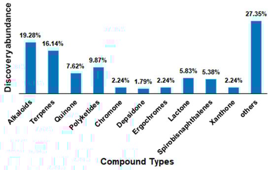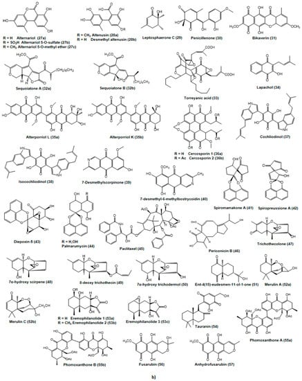 Anticancer compounds of different chemical classes from endophytic fungi-alkaloidal compounds and their derivatives: (a) (1–8), benzo[j]fluoranthene (9), Chromone (10), coumarin (11), depsidones (12, 13), depsideptide (14), ergochromes (15, 16), ester (17), lactones (18–22), lignans (23–24), peptide (25), polykedites (26); (b) polyketides (27–32), quinones (33–39), spirobisnaphthalenes (40–42), terpenes (43–54), xanthones (55), naphthoquinones (56, 57).