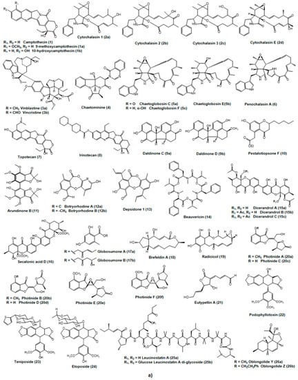 Plants are prolific sources of anticancer agents. In the area of cancer, of the 175 approved small molecules over the years from the 1940s to 2014, 75% (131) are other than synthetic and 49% (85) are either natural products or their derivatives [222]. Very recently, it was reported that among the approved 321 anticancer molecules from all sources during the period of 1946 to 2019, 35 (10.9%) were unaltered natural products and 65 (20.2%) were natural product derivatives compared to 53 (16.5%) completely synthetic drug molecules. Some of these agents obtained from plants are also found in their corresponding endophytic fungi. The following are some examples of plant/endophytic fungi-derived cancer effective agents [1,6] (Figure 3a,b).