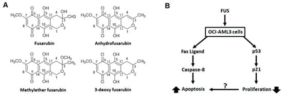 Fusarubin and anhydrofusarubin have been isolated from the endophytic fungi Cladosporium residing inside Rauwolfia leaves. These compounds inhibited the cell growth of different leukemia cell lines (OCI-AML3, HL-60, U937, and Jurkat) by arresting the cell cycle and augmenting apoptosis. Whereas fusarubin exerted an antiproliferative effect on OCI-AML3 cells by up-regulating p21 in a p53-dependent manner, apoptosis was induced only in a small sub-population of leukemic cells by inducing the production of the Fas ligand (Figure 4) [9].