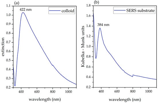 (a) UV-Vis extinction spectrum of the concentrated Lee-Meisel silver colloid (diluted 1:50 in distilled water to avoid optical saturation). (b) UV-Vis diffuse reflectance spectrum of one of the paper sensors produced by centrifugation (Section 2.2) after Kubelka-Munk conversion.