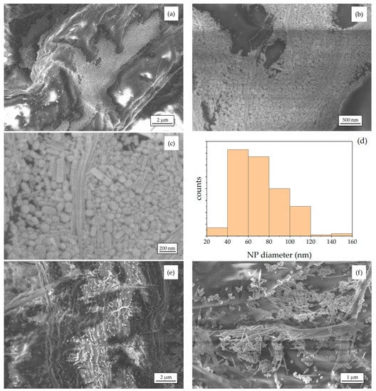 We employed Scanning Electron Microscopy (SEM) to investigate the aggregates of Ag NPs that form on the filter paper. All the images were acquired in the NanoLab (Energy Dept., Politecnico di Milano) by a Zeiss Supra 40 Field-Emission Scanning Electron Microscope (FE-SEM), operating in high-vacuum and equipped with the GEMINI column. Representative SEM micrographs of one substrate produced by centrifugation are shown in Figure 3a–c. Among the paper fibers, we see not only spherical NPs but also bundles of self-assembled nanorods. The particle size distribution was estimated from the SEM micrographs of Figure 3b, and its histogram is reported in Figure 3d. The average diameter of the spherical NPs is ca. 70 nm. For comparison, the SEM micrographs of one substrate produced by natural sedimentation are reported in Figure 3e,f. Remarkably, the Ag NPs and nanorods do not accumulate in the cavities of the fibers, indicating a difference in what happens during the centrifuge-assisted procedure. Instead, the Ag nanostructures are scattered around the fiber surface. We can still distinguish some aggregates of NPs and bundles of rods that are localized in specific regions of the substrate (Figure 3f). It should be mentioned that the SEM micrographs of Figure 3e,f were collected one year after the production: although the substrates were stored in a laboratory cabinet, without adopting specific measures aimed at maintaining them unaltered, the morphology is preserved, and Ag nanostructures are still visible among the fibers.