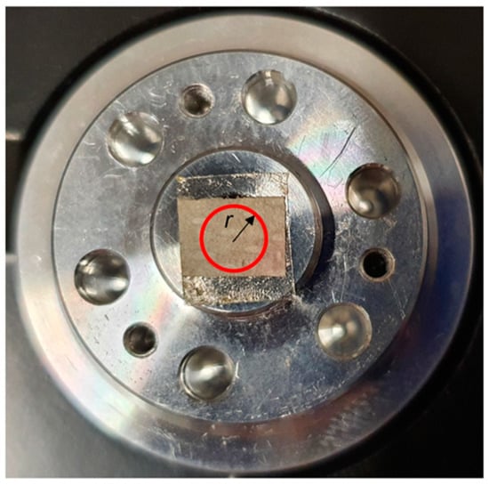 The spinning-cell setup. The substrate is mounted at the center of the rotating device and the laser is kept fixed at distance r from the rotation axis. During the SERS measurement, the laser track on the substrate follows the annular surface highlighted in red.
